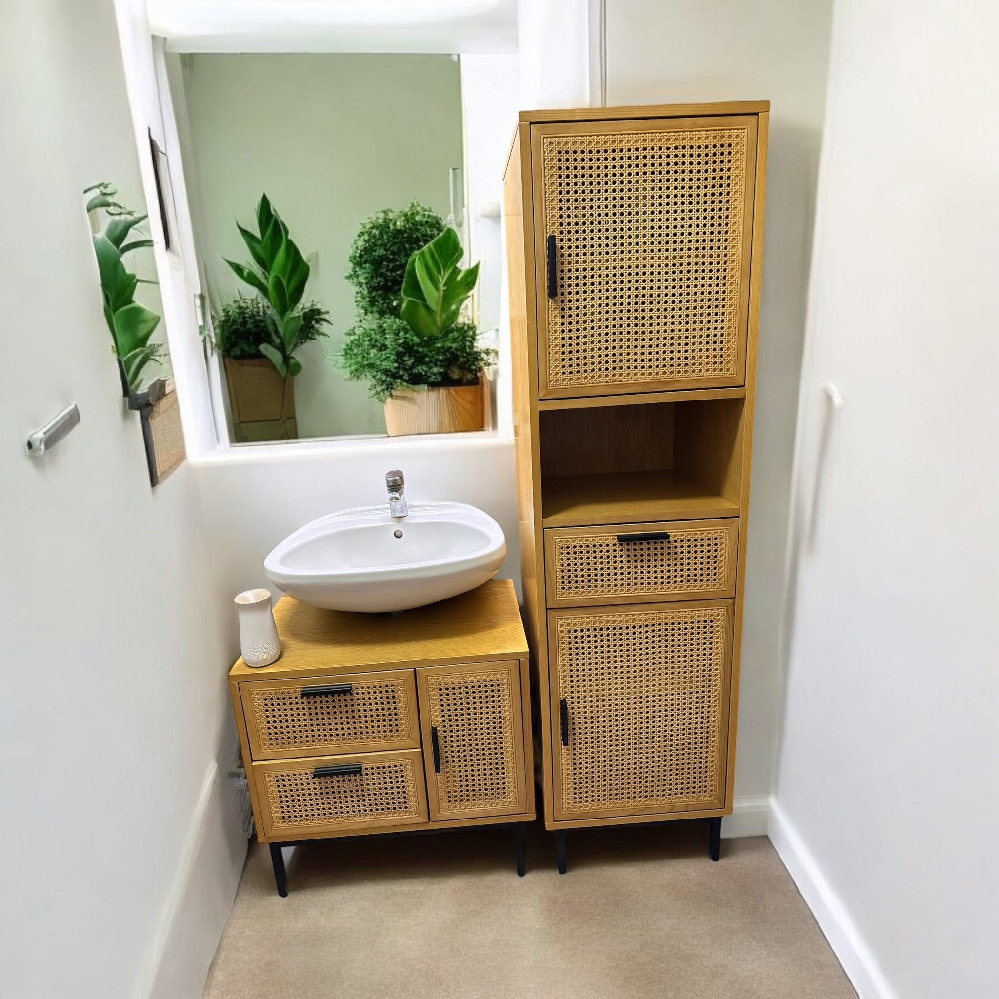 Az állószekrény magas tárolókapacitást biztosít törölközőknek, tisztítószereknek és egyéb kiegészítőknek, míg a mosdó alatti szekrény praktikus helyet kínál mindennapi használati tárgyaknak. A rattan hatású felület melegséget és textúrát ad, a fekete lábak pedig könnyedséget és stabilitást kölcsönöznek a bútornak.